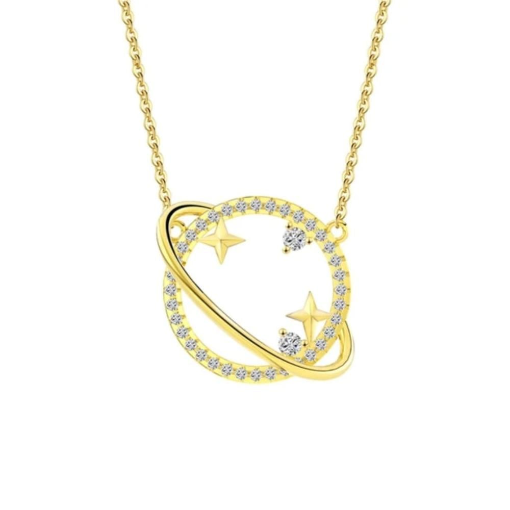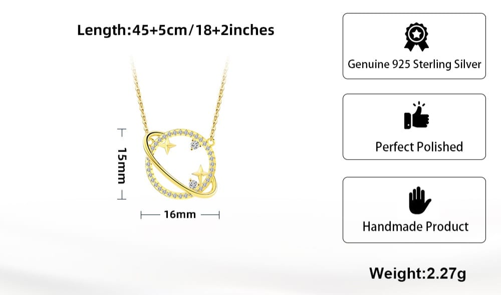 مرصعة بأحجار الزيركون، تتلألأ القلادة بسحرها الخاص ولمعانها الجذاب، مما يضفي عليها لمسة من البريق والجمال. يتميز تصميم القلادة بشكل كوكب مذهل يحتوي على أحجار داخلية ونجمة، مما يعكس أسلوبًا جديدًا ومبتكرًا.