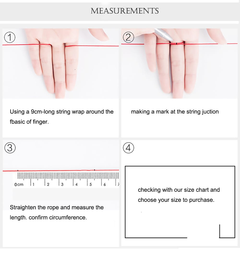4. القياس اليدوي: يمكن استخدام أداة قياس أو خيط رفيع لقياس محيط إصبع اليد. يتم لف الخيط حول الجزء الأوسط من الإصبع وقياس الطول بواسطة مسطرة. يجب أن يكون الخيط مريحًا ولكنه لا يزيد عن الحد الذي يتسبب في ضيق الإصبع. يتم استخدام هذا القياس لتحديد مقاس الخاتم المناسب باستخدام الجداول الموجودة في المحلات.